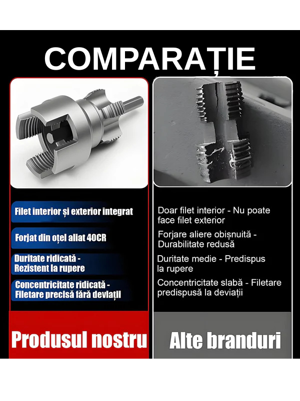 Știi deja cum merge: iei o filieră ieftină, nu taie curat, forțezi puțin și fie strici filetul complet, fie crapi țeava. Ajungi să chemi instalatorul pentru o treabă de 10 minute, plătești manoperă, pierzi o zi întreagă și tot tu rămâi cu problema nerezolvată. Bani aruncați, timp pierdut și lucrarea blocată.